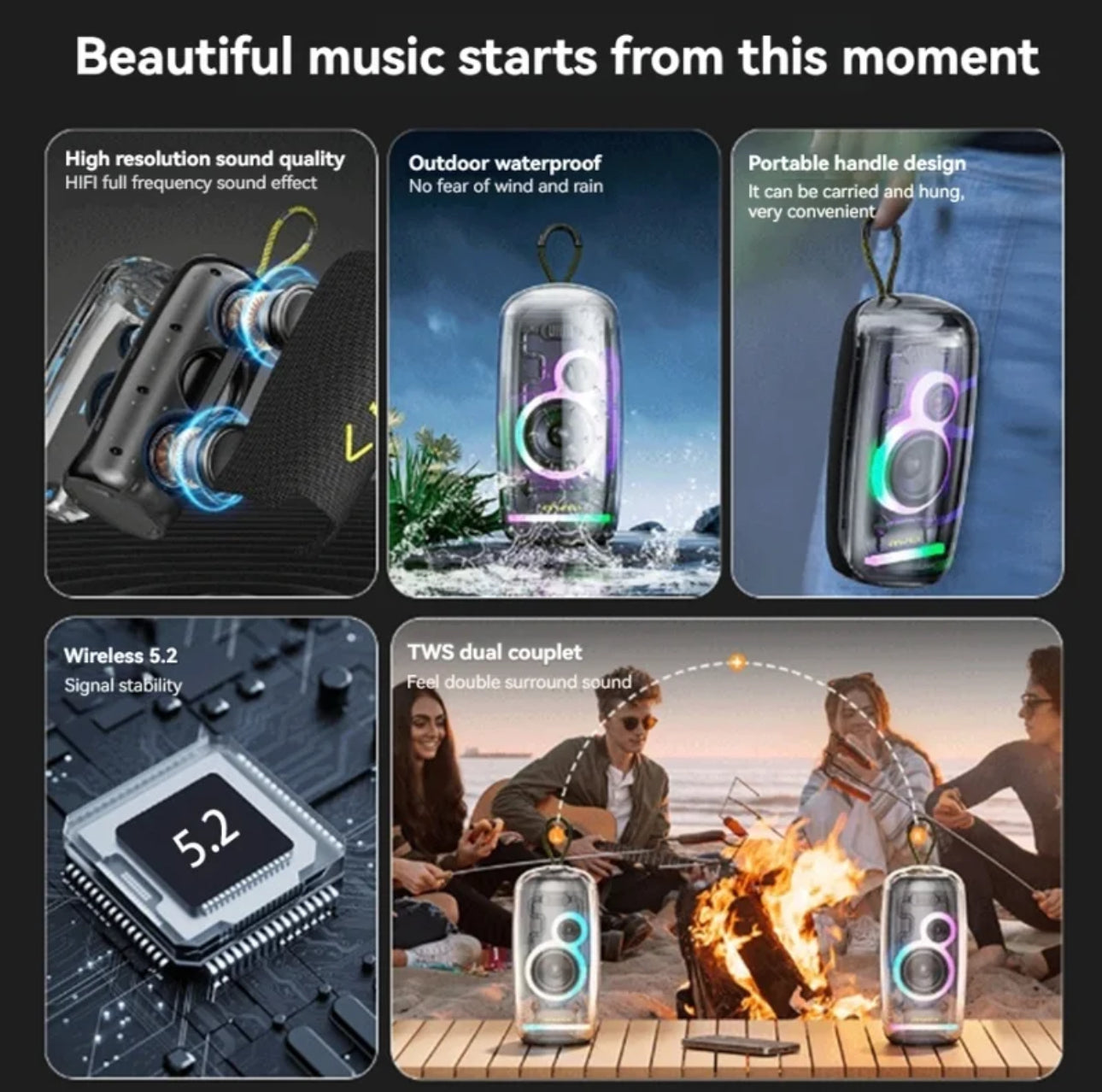 Versatile Playback: Supports TWS pairing, FM radio, TF card, and USB audio